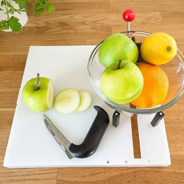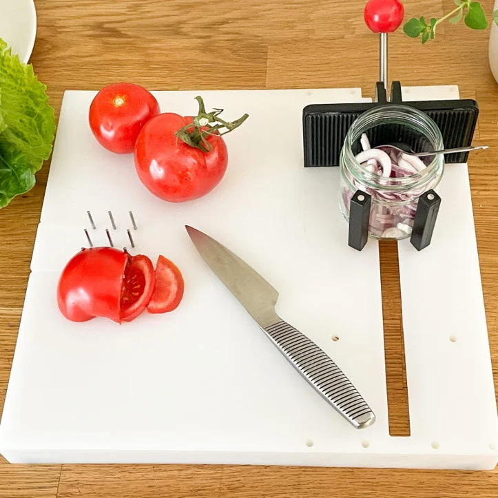 Avec la planche de préparation Fix, râper, couper, fouetter et éplucher deviennent un jeu d’enfant, même avec une faible force dans les mains ou en utilisant une seule main. La planche tient parfaitement en place grâce à ses quatre pieds antidérapants ou à ses ventouses intégrées. Les mâchoires maintiennent fermement un bol, une râpe ou un aliment. Une petite assiette à picots est également fournie pour maintenir les aliments. Amovible, elle peut être placée picots vers le bas pour obtenir une surface plane.