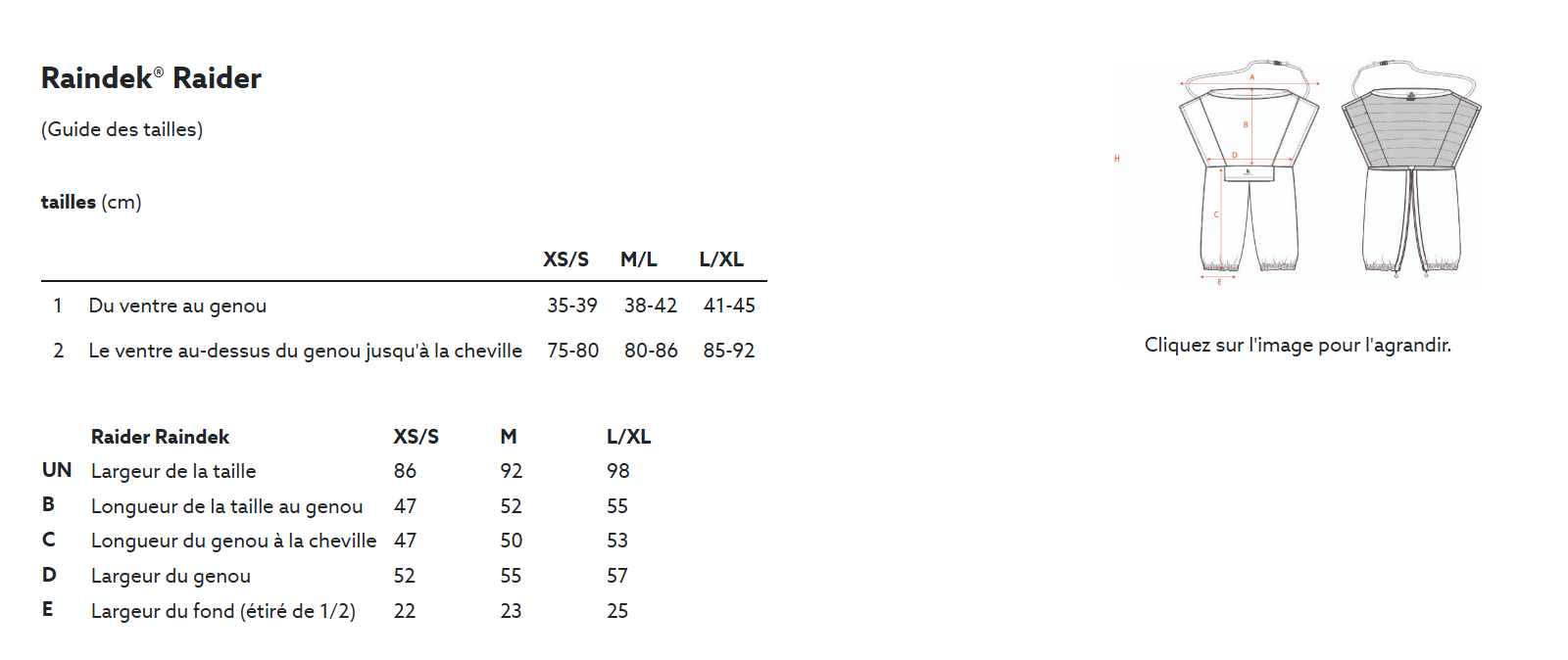 Comment porter et enfiler : Fermez d’abord les fermetures éclair autour du bas des jambes, puis repliez le haut pour couvrir le haut des jambes et fermez la sangle autour de la taille. Portez votre veste par-dessus la partie avant à la taille pour que l’eau s’écoule au-dessus de votre Raindek® et non en dessous 😉